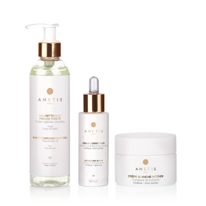 Découvrez notre routine de soins anti-taches en quatres étapes comprenant l’Eau micellaire éclat, le Sérum correcteur clarté, la Crème blanche intense éclat et le Lait corps éclat.